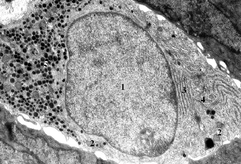 Enteroendokrinní buňka střevního epitelu se zřetelně polarizovanými organelami: jádro (1), mitochondrie (2), zrnité endoplazmatické retikulum (3), Golgiho komplex (4), vakuoly a sekreční granula (5)