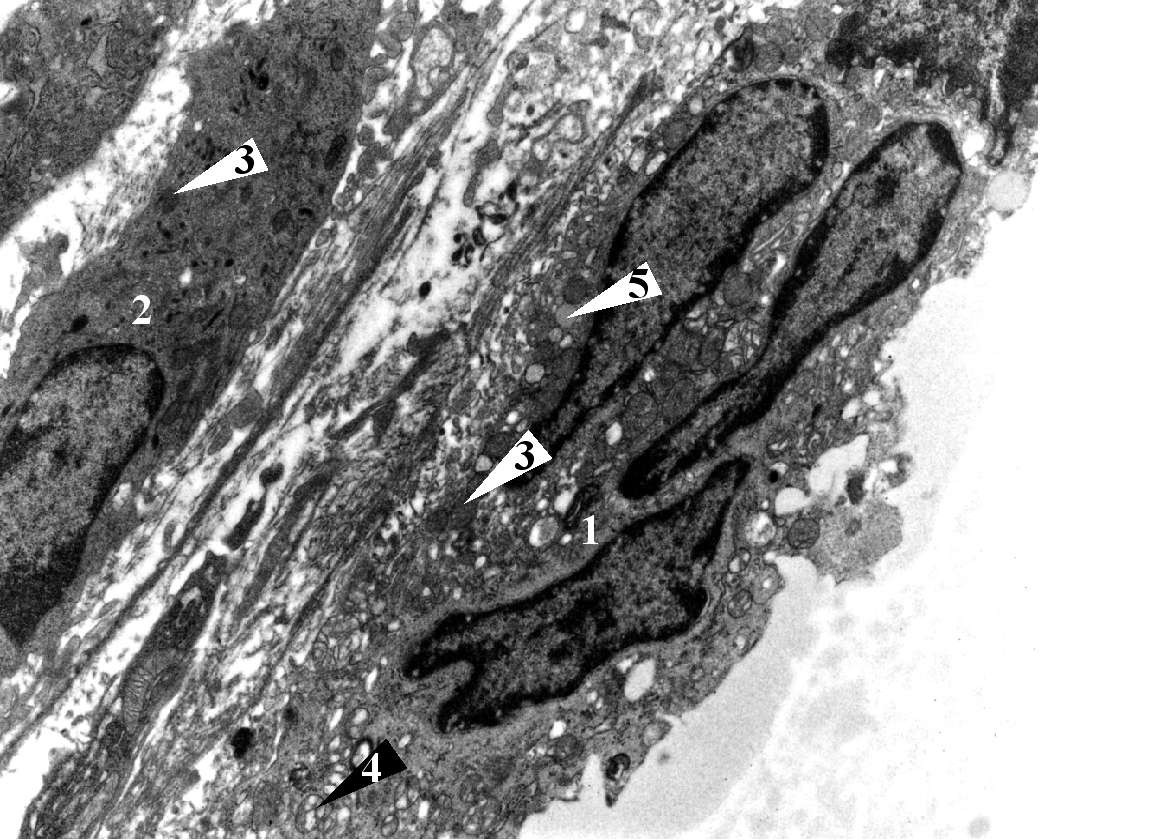 Obrovská mnohojaderná buňka (1) (vzniká z tkáňových makrofágů v důsledku přítomnosti cizorodých částic) a fibrocyt (2). V cytoplazmě mitochondrie (3), sekundární lyzosomy (4) a tukové vakuoly (5).