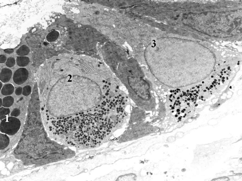 Enteroendokrinní buňky ve střevní kryptě - v blízkosti je Panethova buňka (1) - uzavřený (2) a otevřený (3) typ