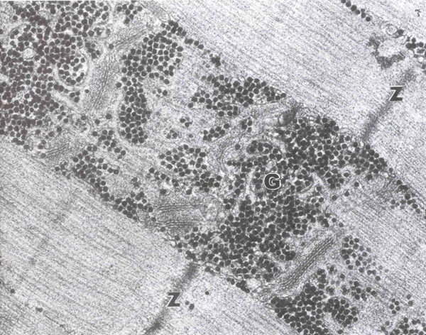 Myofibrila napříč – vzájemné uspořádání aktinových a myozinových filament v TEM.